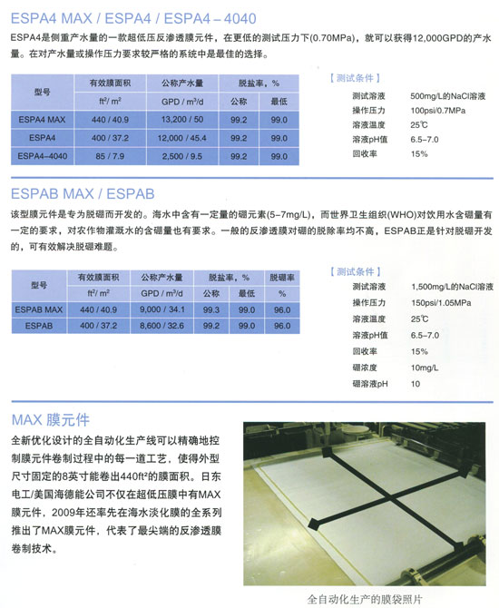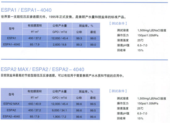 ESPA(Energy Saving Poly Amide)系列反渗透膜元件,是美国海德能公司于1995年5月在世界上率先推出的节能型超低压大通量复合反渗透膜。ESPA系列膜元件保持高脱盐率的同时具有更高的水通量特性,即在相同的产水量下,它的运行压力比传统低压反渗透膜运行压力低25-40%。ESPA系列膜元件的高水通量、高脱盐率的特征,使得设备制造成本和系统运行费用大为降低,并且节约了大量能源,进而使得反渗透系统更加容易推广并被认可。